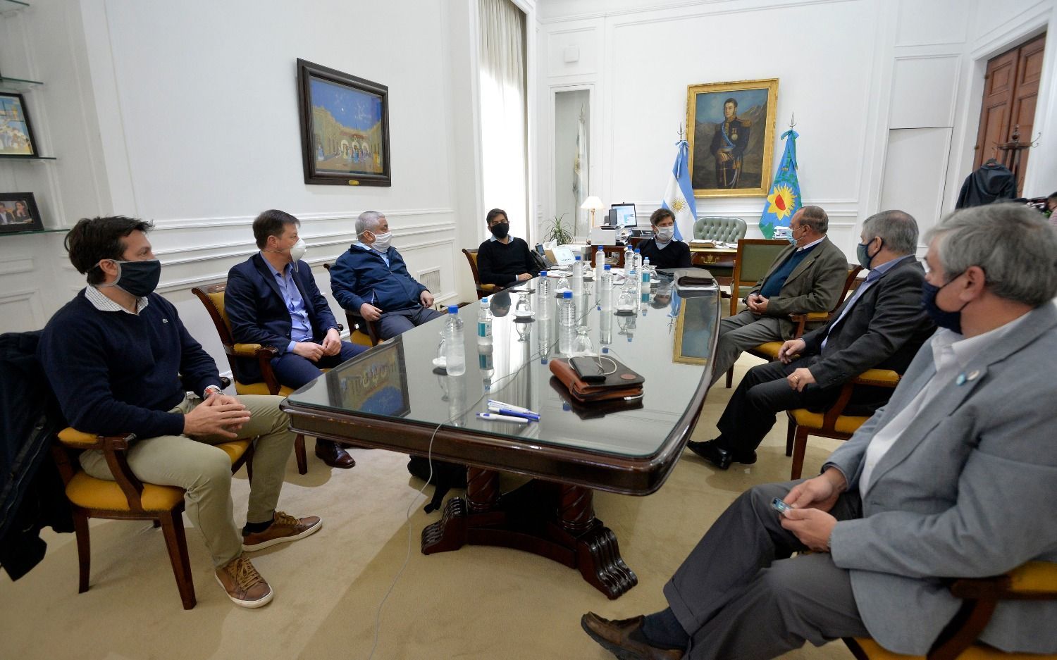 Durante el encuentro, Kicillof analizó junto a Guillermo Britos (Chivilcoy), Arturo Rojas (Necochea), Juan Miguel Nosetti (Salliqueló), Cecilio Salazar (San Pedro), Carlos Sánchez (Tres Arroyos) y Carlos Bevilacqua (Villarino) la situación sanitaria y financiera de cada distrito.